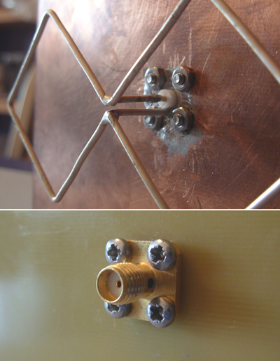 Di biquad ne ho costruite diverse versioni, che differiscono sostanzialmente per la modalità di alimentazione del radiatore. Su internet viene consigliato spesso l'uso di un bazooka, ovvero un tratto di tubo di lunghezza pari ad un quarto di lunghezza d'onda posto sul retro del riflettore, all'interno del quale far scorrere il coassiale che alimenta l'antenna.